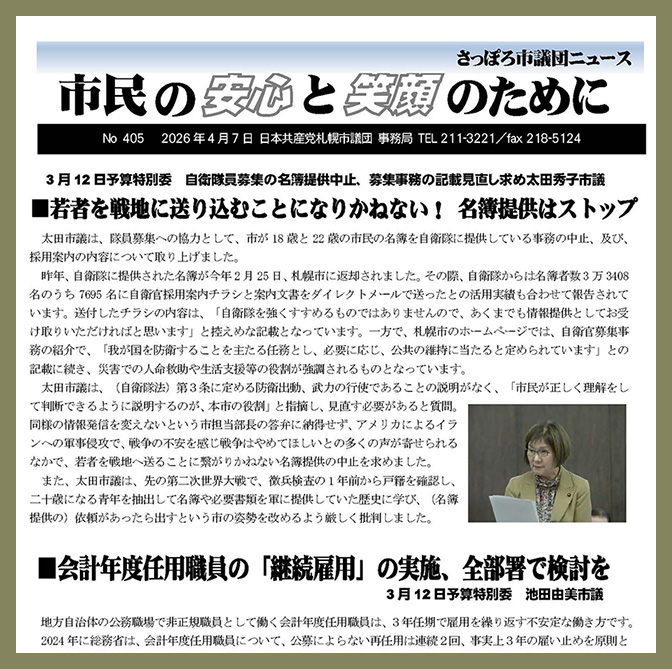 home page p55-31top-imag2017-3 最新記事 市民の安心と笑顔のために:さっぽろ市議団... PDFで開く Read more 軍拡で戦争は止められない:平和をどう守る... 2026年3月30日に太田秀子札幌市議会 Read more あらたな増税 私は、2026年度の国家予算案を見て、あ Read more 市民の安心と笑顔のために:さっぽろ市議団... PDFで開く Read more 東日本大震災から15年 太田秀子札幌市議会議員は、「今日は、3月 Read more 札幌市議会第1回定例会で代表質問:市民の... 2026年2月19日(木)札幌市議会第1 Read more 若者たちの未来が明るく平和でありますよう... 1月11日に札幌市東区二十歳のつどいが行 Read more 寄せられた声を受けて議会で質問:東区民報... 市民置き去りのまちづくりから、市民のため Read more 年末年始 帰宅して、本箱から不破さんの本を探しまし Read more 知ってる?市住家賃値上げ 市営住宅家賃値上げが大きな問題となってい Read more ご案内:市政こんだん会「困っていることは... 12月14日(日曜日)10:00~11: Read more 事務所だより(2025年12月号外) PDFで開く みんなの願い「危険な交差点 Read more 1 2 3 … 12 Next »