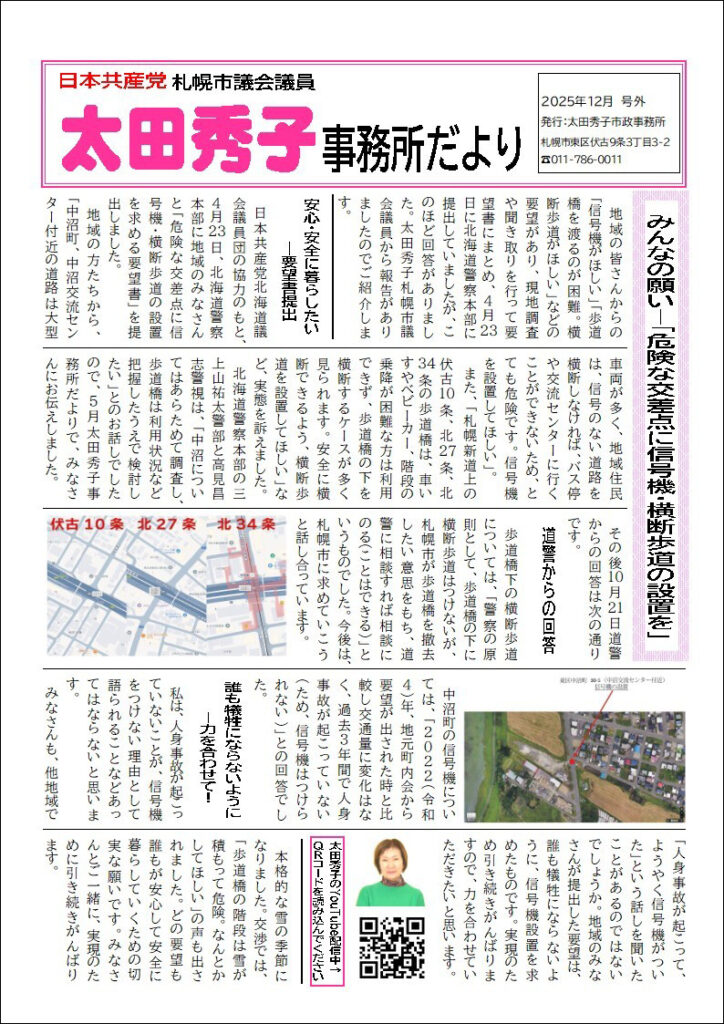 みなさんも、他地域で「人身事故が起こって、ようやく信号機がついた」という話しを聞いたことがあるのではないでしょうか。地域のみなさんが提出した要望は、誰も犠牲にならないように、信号機設置を求めたものです。実現のため引き続きがんばりますので、力を合わせていただきたいと思います。