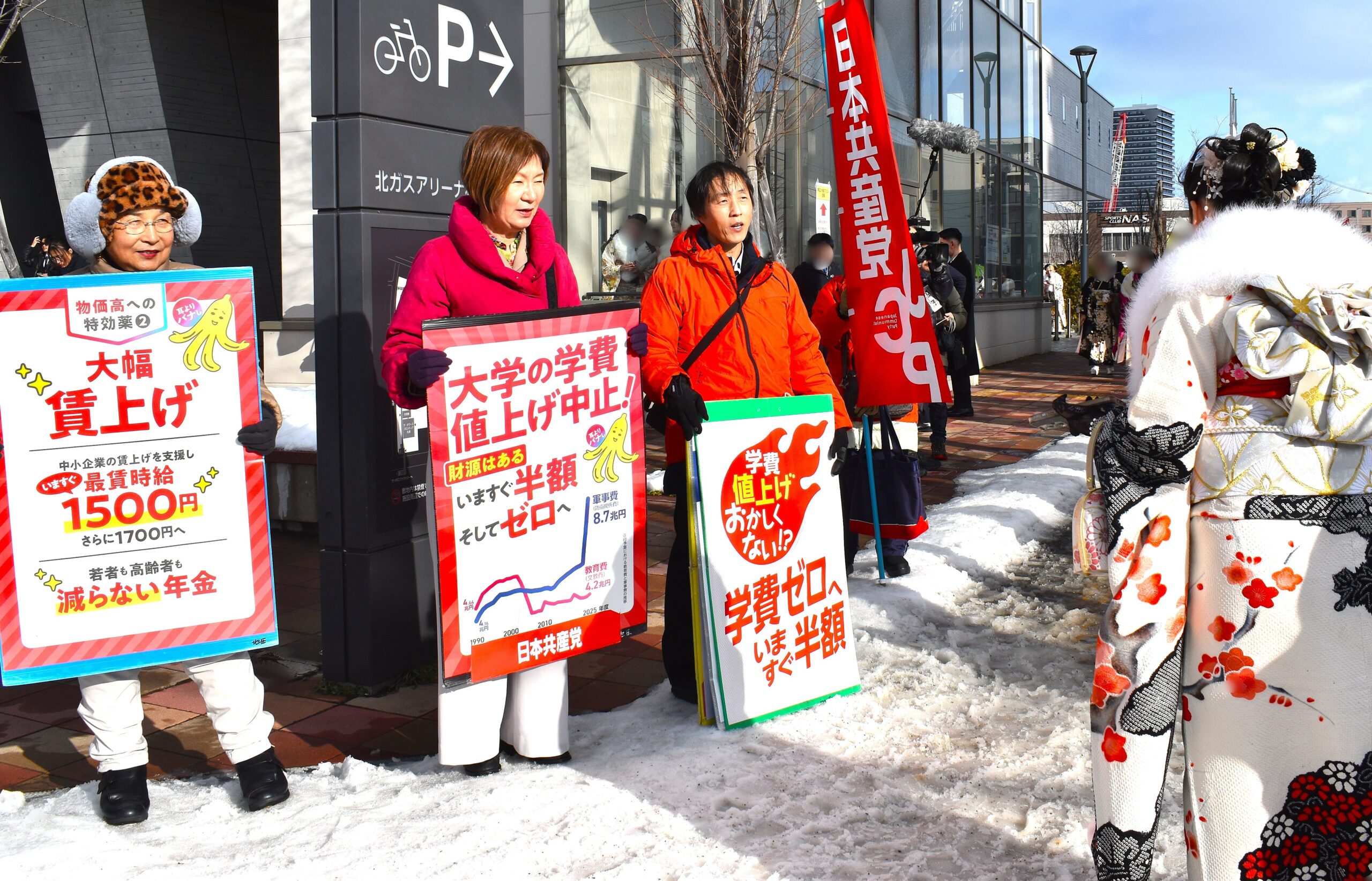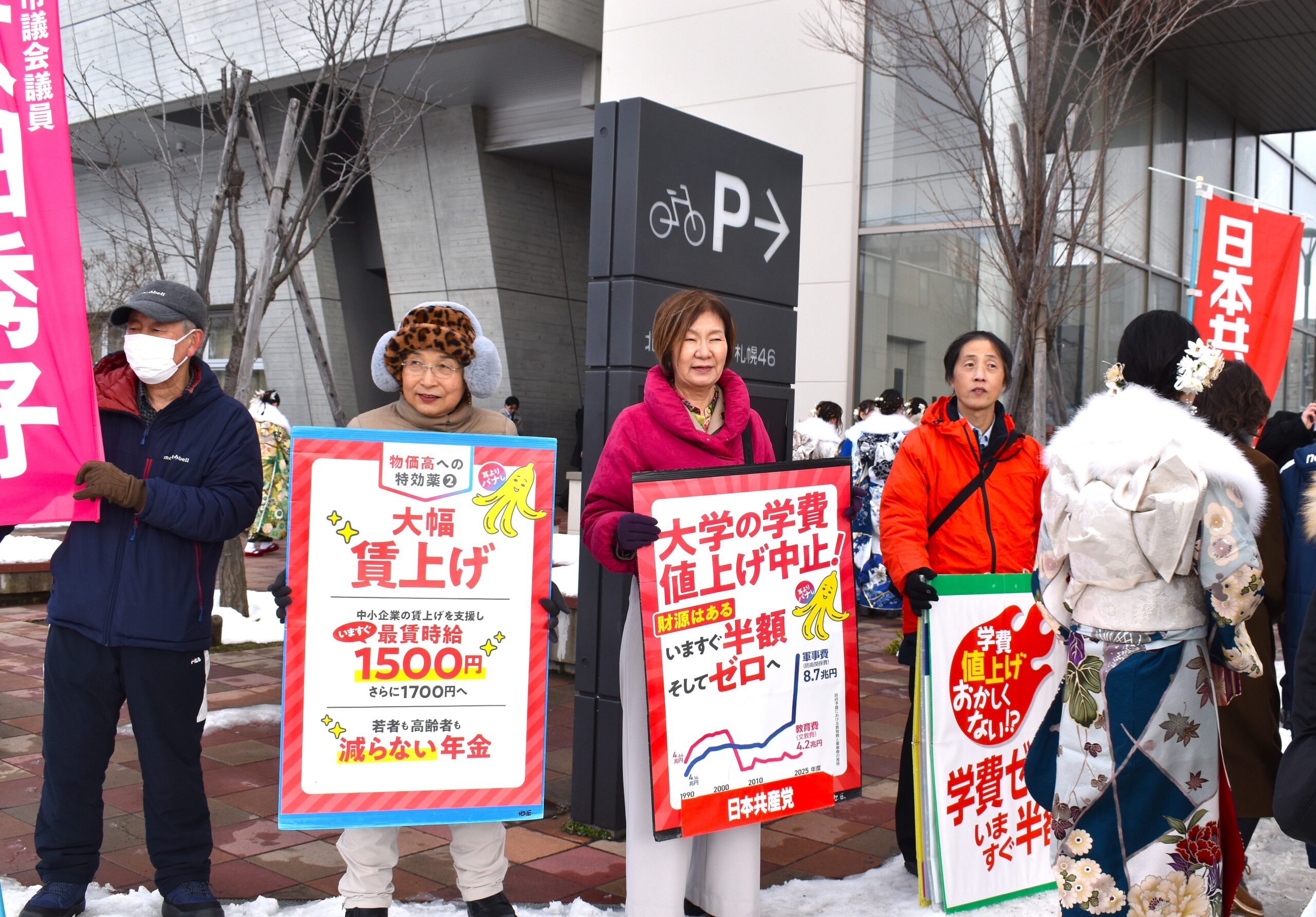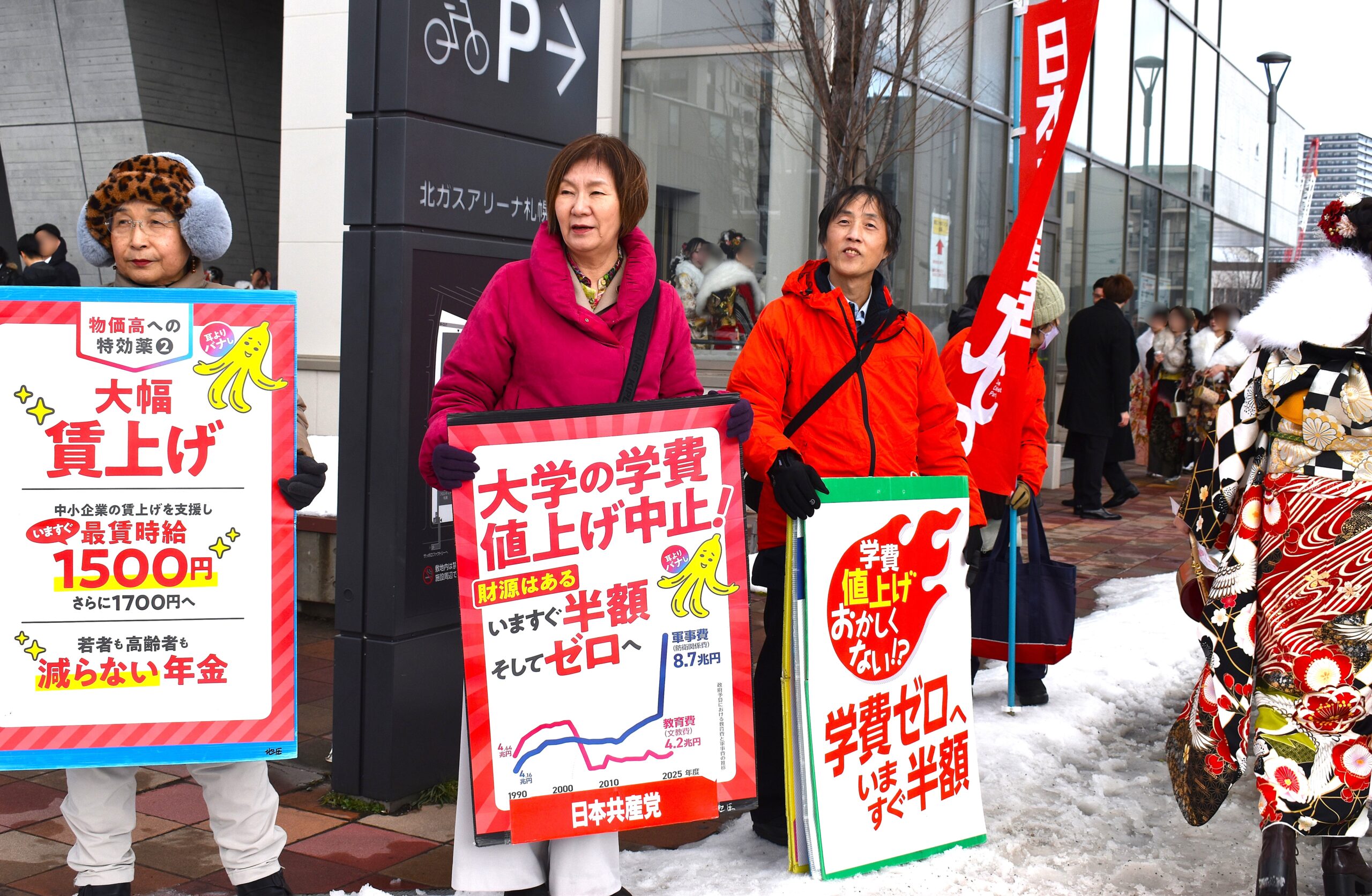 1月11日に札幌市東区二十歳のつどいが行われた成人式会場前で、後援会員のみなさんと「成人おめでとう」宣伝を行いました。