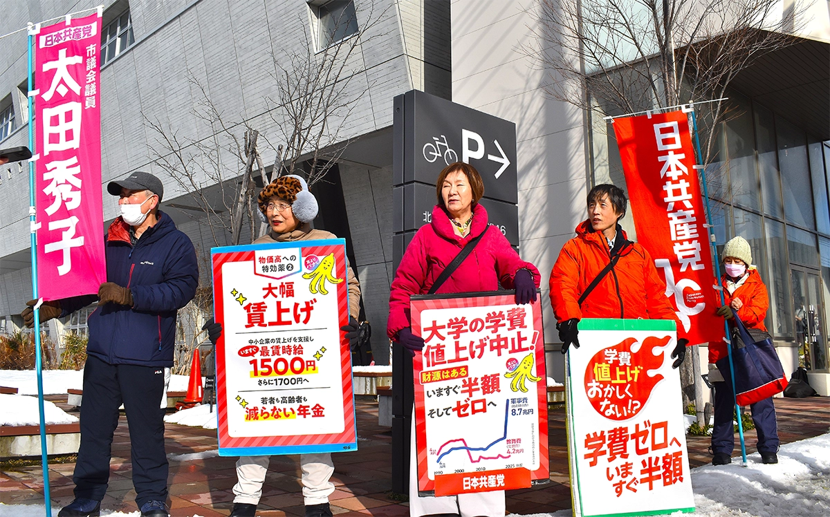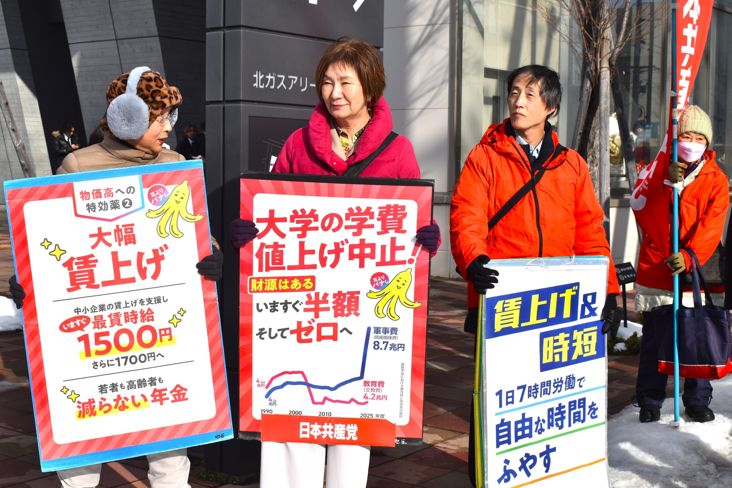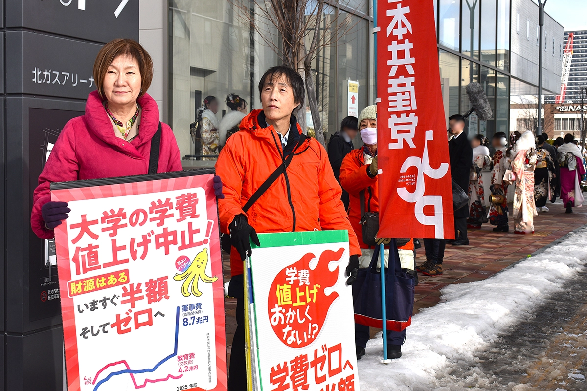 1月11日に札幌市東区二十歳のつどいが行われた成人式会場前で、後援会員のみなさんと「成人おめでとう」宣伝を行いました。