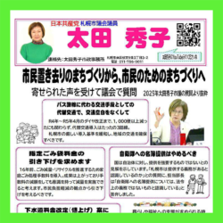キャラバン宣伝を終えて、太田事務所の前の通りを車で移動していた時、低学年の小学生たちが7・8人、横断歩道を小走りに渡りながら何か話しています。渡りきったところで、事務所の花壇のレンガに並んで腰かけ、今話していたことを確認するかのように、ランドセルを開けノートかプリントかを見せ合っています。